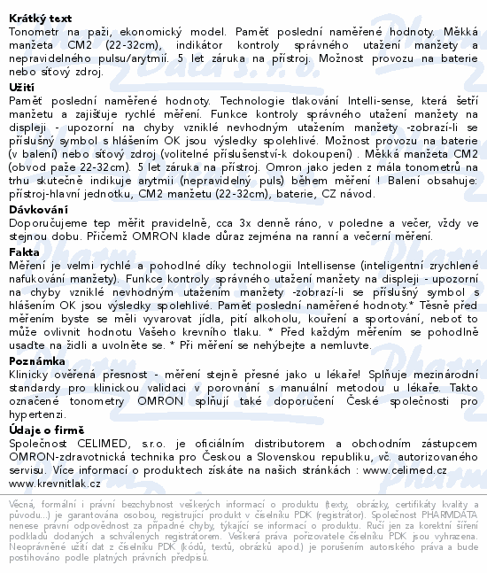 Tonometr na paži, ekonomický model. Paměť poslední naměřené hodnoty. Měkká manžeta CM2 (22-32cm), indikátor kontroly správného utažení manžety a nepravidelného pulsu/arytmií. 5 let záruka na přístroj. Možnost provozu na baterie nebo síťový zdroj.