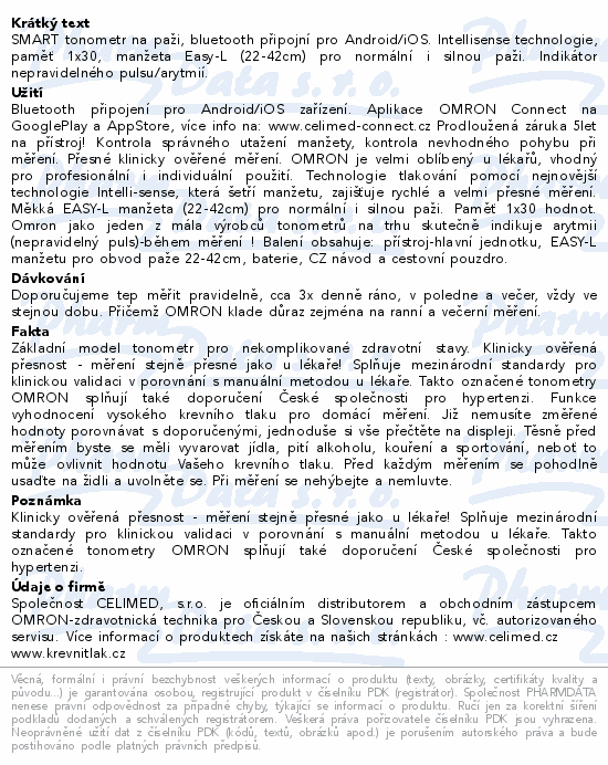 SMART tonometr na paži, bluetooth připojní pro Android/iOS. Intellisense technologie, paměť 1x30, manžeta Easy-L (22-42cm) pro normální i silnou paži. Indikátor nepravidelného pulsu/arytmií.