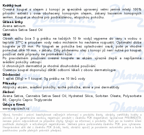 Ovesná koupel s olejem z konopí je speciálně upravený velmi jemně mletý 100% přírodní extrakt z ovsa obohacený konopným olejem, získaný lisovaním konopných semen. Koupel je vhodná pro podrážděnou, atopickou pokožku.