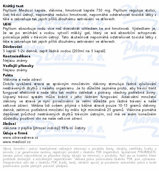 Psyllium Medicol kapsle, vláknina, hmotnost kapsle 750 mg. Psyllium reguluje stolici, čistí trávicí ústrojí, napomáhá redukci hmotnosti, napomáhá odstraňovat toxické látky z těla a zabraňuje tak jejich příliš dlouhému setrvávání ve střevech.
