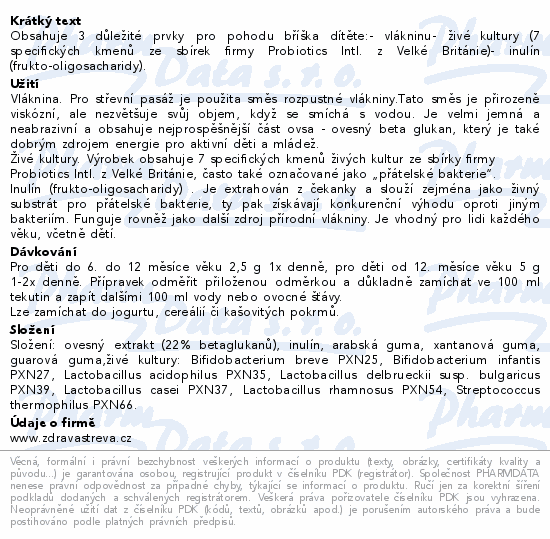 Obsahuje 3 důležité prvky pro pohodu bříška dítěte:- vlákninu- živé kultury (7 specifických kmenů ze sbírek firmy Probiotics Intl. z Velké Británie)- inulín (frukto-oligosacharidy).