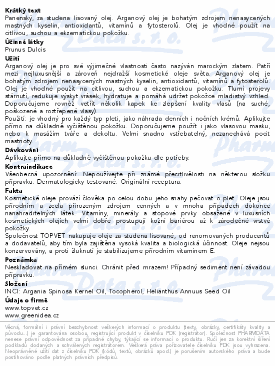 Panenský, za studena lisovaný olej. Arganový olej je bohatým zdrojem nenasycených mastných kyselin, antioxidantů, vitamínů a fytosterolů. Olej je vhodné použít na citlivou, suchou a ekzematickou pokožku.