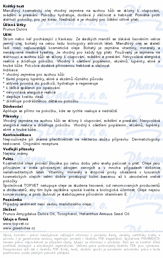 Mandlový kosmetický olej vhodný zejména na suchou kůži se sklony k olupování, svědění a praskání. Pokožku hydratuje, dodává jí vláčnost a hebkost. Pomáhá proti stárnutí pokožky, pro její krásu. Nedráždí a je vhodný pro čištění citlivé pleti.