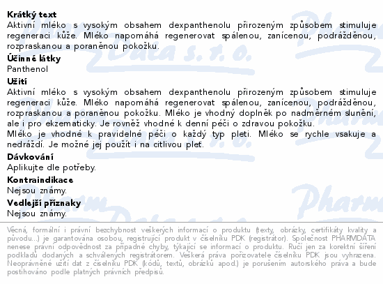 Aktivní mléko s vysokým obsahem dexpanthenolu přirozeným způsobem stimuluje regeneraci kůže. Mléko napomáhá regenerovat spálenou, zanícenou, podrážděnou, rozpraskanou a poraněnou pokožku.