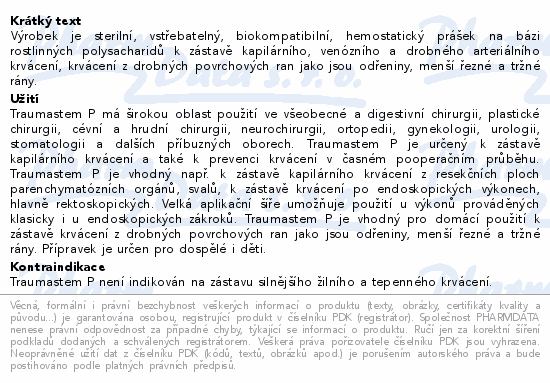 Výrobek je sterilní, vstřebatelný, biokompatibilní, hemostatický prášek na bázi rostlinných polysacharidů k zástavě kapilárního, venózního a drobného arteriálního krvácení, krvácení z drobných povrchových ran jako jsou odřeniny, menší řezné a tržné rány.