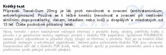 TRAVEL GUM 20MG léčivé žvýkací gumy 10 od výrobce Hermes Pharma je registrovaný léčivý přípravek. Čtěte pozorně příbalový leták.