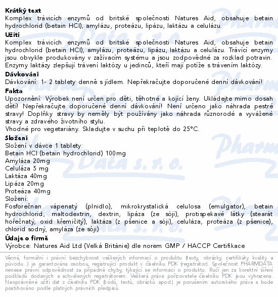 Komplex trávicích enzymů od britské společnosti Natures Aid, obsahuje betain hydrochlorid (betain HCl), amylázu, proteázu, lipázu, laktázu a celulázu.