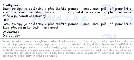 Šátek trojcípý je použitelný v předlékařské pomoci i ambulantní péči, při poranění a fixaci především končetin, hlavy apod. Trojcípý šátek je vyroben z úpletu viskózové střiže a je jednotlivě zabalený.