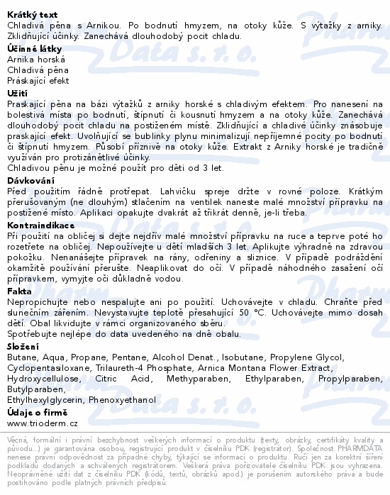 Chladivá pěna s Arnikou. Po bodnutí hmyzem, na otoky kůže. S výtažky z arniky. Zklidňující účinky. Zanechává dlouhodobý pocit chladu.