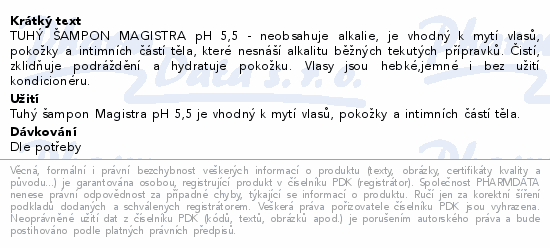 TUHÝ ŠAMPON MAGISTRA pH 5,5 - neobsahuje alkalie, je vhodný k mytí vlasů, pokožky a intimních částí těla, které nesnáší alkalitu běžných tekutých přípravků. Čistí, zklidňuje podráždění a hydratuje pokožku. Vlasy jsou hebké,jemné i bez užití kondicionéru.