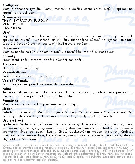 Mast s obsahem tymiánu, kafru, mentolu a dalších esenciálních olejů k aplikaci na hrudník při prochlazení.