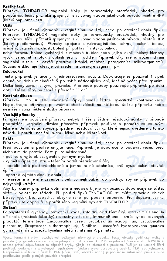 Přípravek TYNDAFLOR vaginální čípky je zdravotnický prostředek, vhodný pro podpůrnou léčbu příznaků spojených s vulvovaginitidou jakéhokoli původu, včetně HPV (lidský papilomavirus).