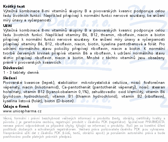 Výtečná kombinace 8-mi vitamínů skupiny B a pivovarských kvasnic podporuje celou řadu životních funkcí. Například přispívají k normální funkci nervové soustavy, ke snížení míry únavy a vyčerpanosti.
