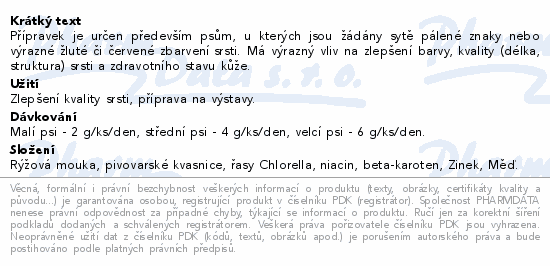 Přípravek je určen především psům, u kterých jsou žádány sytě pálené znaky nebo výrazné žluté či červené zbarvení srsti. Má výrazný vliv na zlepšení barvy, kvality (délka, struktura) srsti a zdravotního stavu kůže.