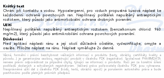 Chrání při kontaktu s vodou. Hypoalergenní, pro vzduch propustná kusová náplast ke každodenní ochraně povrchových ran. Nepřilnavý polštářek napuštěný antiseptickým roztokem, který působí jako antimirkobiální ochrana drobných poranění.