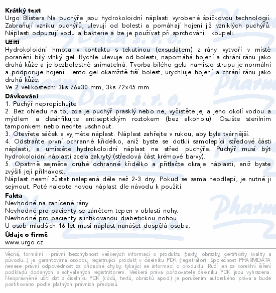 Urgo Blisters Na puchýře jsou hydrokoloidní náplasti vyrobené špičkovou technologií. Zabraňují vzniku puchýřů, ulevují od bolesti a pomáhají hojení již vzniklých puchýřů. Náplasti odpuzují vodu a bakterie a lze je používat při sprchování i koupeli.
