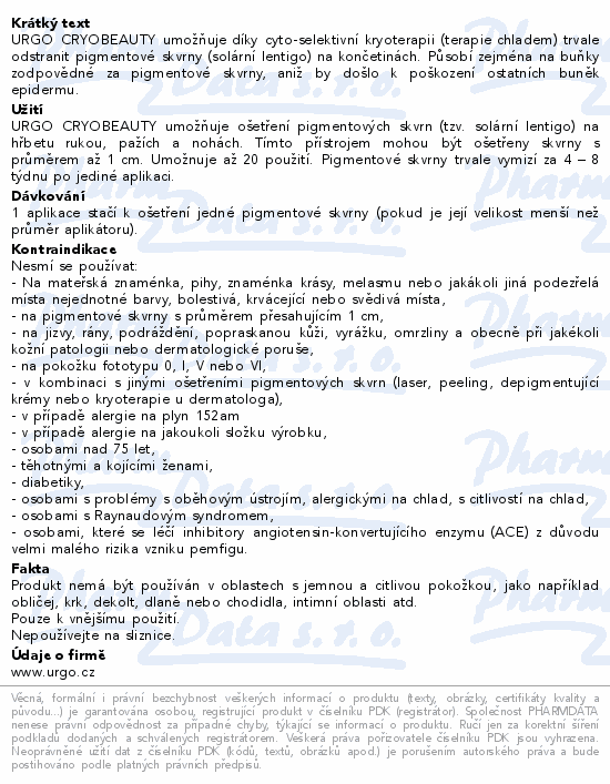 URGO CRYOBEAUTY umožňuje díky cyto-selektivní kryoterapii (terapie chladem) trvale odstranit pigmentové skvrny (solární lentigo) na končetinách. Působí zejména na buňky zodpovědné za pigmentové skvrny, aniž by došlo k poškození ostatních buněk epidermu.