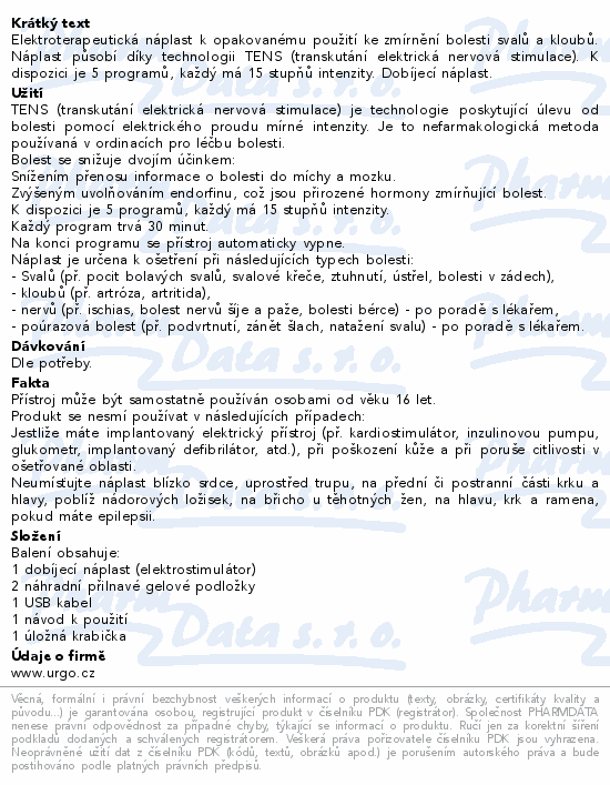 Elektroterapeutická náplast k opakovanému použití ke zmírnění bolesti svalů a kloubů. Náplast působí díky technologii TENS (transkutání elektrická nervová stimulace). K dispozici je 5 programů, každý má 15 stupňů intenzity. Dobíjecí náplast.