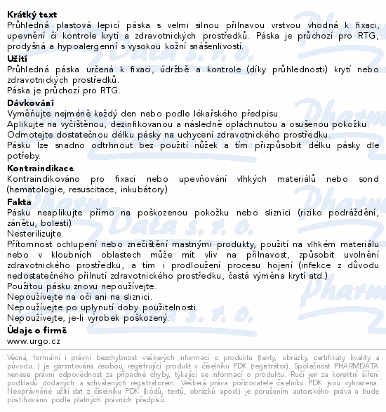 Průhledná plastová lepicí páska s velmi silnou přilnavou vrstvou vhodná k fixaci, upevnění či kontrole krytí a zdravotnických prostředků. Páska je průchozí pro RTG, prodyšná a hypoalergenní s vysokou kožní snášenlivostí.