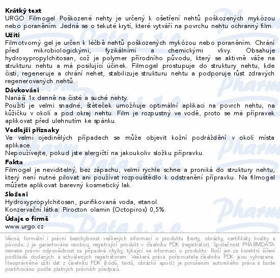 URGO Filmogel Poškozené nehty je určený k ošetření nehtů poškozených mykózou nebo poraněním. Jedná se o tekuté krytí, které vytváří na povrchu nehtu ochranný film.