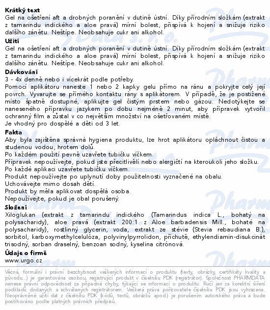 Gel na ošetření aft a drobných poranění v dutině ústní. Díky přírodním složkám (extrakt z tamarindu indického a aloe pravá) mírní bolest, přispívá k hojení a snižuje riziko dalšího zánětu. Neštípe. Neobsahuje cukr ani alkohol.