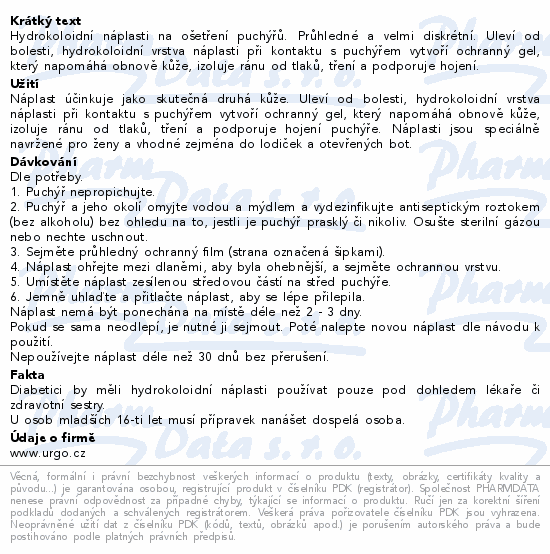 Hydrokoloidní náplasti na ošetření puchýřů. Průhledné a velmi diskrétní. Uleví od bolesti, hydrokoloidní vrstva náplasti při kontaktu s puchýřem vytvoří ochranný gel, který napomáhá obnově kůže, izoluje ránu od tlaků, tření a podporuje hojení.