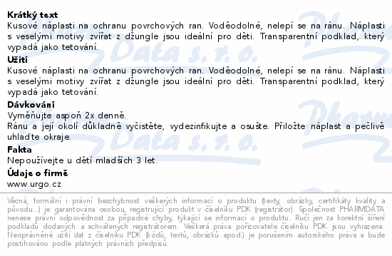 Kusové náplasti na ochranu povrchových ran. Voděodolné, nelepí se na ránu. Náplasti s veselými motivy zvířat z džungle jsou ideální pro děti. Transparentní podklad, který vypadá jako tetování.