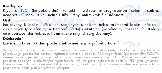 Krytí s TLC (lipidokoloidní) kontaktní vrstvou impregnovanou solemi stříbra, neadhezivní, neokluzivní, nelne k lůžku rány, antimikrobiální účinnost.