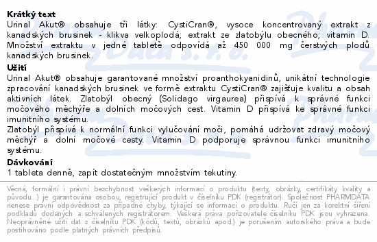 Urinal Akut® obsahuje tři látky: CystiCran®, vysoce koncentrovaný extrakt z kanadských brusinek - klikva velkoplodá; extrakt ze zlatobýlu obecného; vitamin D. Množství extraktu v jedné tabletě odpovídá až 450 000 mg čerstvých plodů kanadských brusinek.