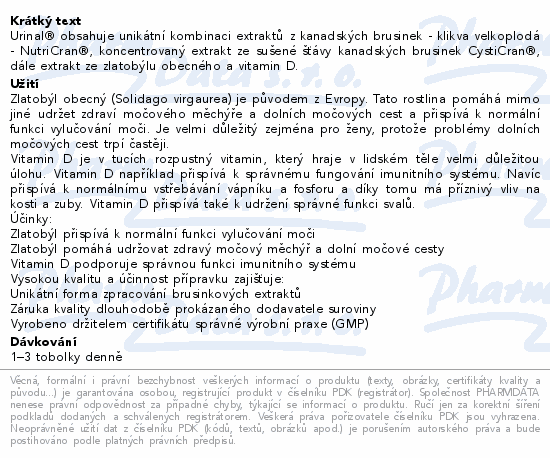 Urinal® obsahuje unikátní kombinaci extraktů z kanadských brusinek - klikva velkoplodá - NutriCran®, koncentrovaný extrakt ze sušené šťávy kanadských brusinek CystiCran®, dále extrakt ze zlatobýlu obecného a vitamin D.