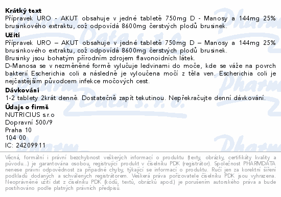 Přípravek URO - AKUT obsahuje v jedné tabletě 750mg D - Manosy a 144mg 25% brusinkového extraktu, což odpovídá 8600mg čerstvých plodů brusinek.