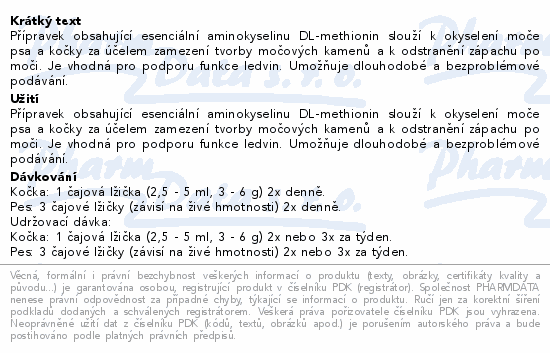 Přípravek obsahující esenciální aminokyselinu DL-methionin slouží k okyselení moče psa a kočky za účelem zamezení tvorby močových kamenů a k odstranění zápachu po moči. Je vhodná pro podporu funkce ledvin. Umožňuje dlouhodobé a bezproblémové podávání.