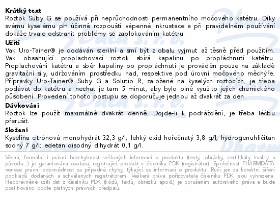 Uro-Tainer jsou udržovací roztoky pro dlouhodobě zavedené uretrální a suprapubické katétry. Jedná se o sterilní zdravotnické prostředky bez endotoxinů připravené k použití ve vacích bez obsahu PVC s následujícím účelem: Uro-Tainer Suby G: Rozpuštění inkrustace Nepoužívejte Uro-Tainer v případě hypersenzitivity (alergie) na jakoukoliv ze složek roztoku. V případě cystitidy nebo jiných urogenitálních onemocnění, které mohou být provázeny hematurií (přítomností krve v moči). Několik dní po operaci močového měchýře nebo močového traktu. Upozornění a opatření - Před použitím prostředku Uro-Tainer se poraďte se svým lékařem, lékárníkem nebo zdravotní sestrou. - Za žádných okolností nesmí být roztok podán injekčně nebo infuzí. - Nechte vykapat na základě působení gravitace, nepoužívejte sílu. - Při aplikaci použijte aseptickou techniku. Před použitím se doporučuje dezinfikovat port. - Lze použít pouze tehdy, pokud jsou vak a těsnící uzávěr neporušeny a roztok je čirý. - Tento systém je určen k jednorázovému použití. Po otevření neodkladně spotřebujte a zlikvidujte. Opakované používání těchto prostředků vytváří potenciální riziko pro pacienta a uživatele. Může to vést ke kontaminaci a/nebo omezené funkčnosti prostředku, což způsobuje zranění, onemocnění nebo smrt pacienta. - Po použití řádně zlikvidujte. - Jestliže během proplachování roztok unikne z močové trubice, není katétr v močovém měchýři správně umístěn. V takovém případě je třeba nahradit katétr novým. - Jestliže roztok neproudí, může to být tím, že je katétr ohnutý nebo ucpaný. V takovém případě je třeba nahradit katétr novým. - Při zákroku u pacientů s poraněním míchy postupujte mimořádně opatrně, neboť hrozí riziko autonomní dysreflexie. Jak se prostředek Uro-Tainer používá - Uro-Tainer jsou uzavřené a sterilní systémy pro připojení k močovému katétru a pracuje se s nimi podle návodu k použití. - Vak Uro-Tainer je dodáván sterilní a smí být z obalu vyjmut až těsně před použitím. - Je-li třeba, ohřejte roztok v obalu na tělesnou teplotu tak, že uzavřený obal ponoříte do teplé vody. - Vak obsahující proplachovací roztok sbírá kapalinu po propláchnutí katétru. Proplachování katétru a sběr kapaliny po propláchnutí je prováděn pouze na základě gravitační síly, udržováním prostředku nad, respektive pod úrovní močového měchýře. - Uro-Tainer Suby G, založený na kyselých roztocích, je třeba podávat do katétru a nechat je tam 5 minut, aby bylo plně využito jejich chemického působení. Provedení tohoto postupu se doporučuje jednou až dvakrát za den. - Obecně je každodenní používání indikováno během krátkého období pro pacienty po operaci. Naproti tomu mají dlouhodobě katetrizovaní pacienti zaveden katétr po velmi dlouhou dobu. V takovém případě je katétr promýván roztokem Uro-Tainer pouze 2–3krát týdně. - Jestliže prostředek Uro-Tainer používáte častěji, než byste měli, nejsou očekávány žádné nežádoucí reakce. Možné nežádoucí účinky Kyselina citronová může u některých pacientů vyvolávat mírné podráždění, případně i přechodnou bolest, pocit pálení nebo spasmy močového měchýře (nutkání na močení). Jestliže takové účinky nastanou, je doporučeno podávat méně koncentrovaný roztok Suby G, provádět instilaci méně často nebo ji nahradit instilací NaCl 0,9 %, protože u tohoto roztoku nejsou tyto vedlejší účinky známy. Jak se prostředek Uro-Tainer uchovává Uchovávejte prostředek Uro-Tainer mimo dohled a dosah dětí. Nepoužívejte prostředek Uro-Tainer po datu exspirace, které je uvedeno na vnějším plastovém sáčku. Neochlazujte ani nezmrazujte. Uchovávejte v původním obalu. Používejte pouze čisté rozpouštědlo v neporušených láhvích. Po otevření musí být prostředek Uro-Tainer neodkladně spotřebován a zlikvidován. Co prostředek Uro-Tainer obsahuje Uro-Tainer Suby G 100 ml roztoku obsahuje Monohydrát kyseliny citronové 3,23 g, lehký uhličitan hořečnatý, bikarbonát sodný, dihydrát edetátu disodného ve vodě pro injekce. Jak roztok Uro-Tainer vypadá a co obsahuje balení Roztok vypadá jako čistá a bezbarvá kapalina. Prostředek Uro-Tainer tvoří měkký vak bez obsahu polyvinylchloridu (PVC) s přivařenou ohebnou hadičkou bez obsahu PVC a katétrový uzávěr. Jako materiál na vak je použita bezbarvá průhledná farmaceutická fólie. Uro-Tainer Suby G je zdravotnický prostředek. Uro-Tainer Suby G je udržovací roztok určený pro uretrální a suprapubické katétry. Před použitím si prosím pečlivě přečtěte návod k použití, neboť tento obsahuje informace o rizicích spojených s používáním zdravotnického prostředku a další důležité informace.