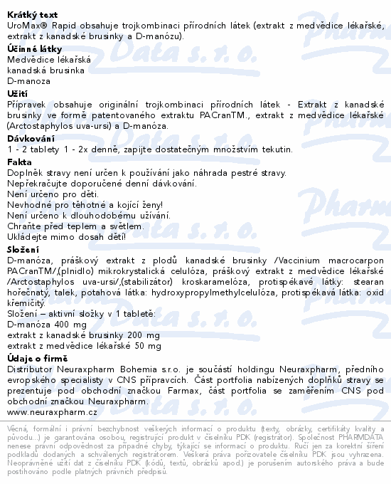 UroMax® Rapid obsahuje trojkombinaci přírodních látek (extrakt z medvědice lékařské, extrakt z kanadské brusinky a D-manózu).