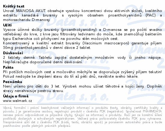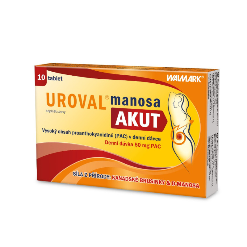 Uroval MANOSA AKUT obsahuje vysokou koncentraci dvou aktivních složek, kvalitního extraktu kanadské brusinky s vysokým obsahem proanthokyanidinů (PAC) a monosacharidu D-manosy.