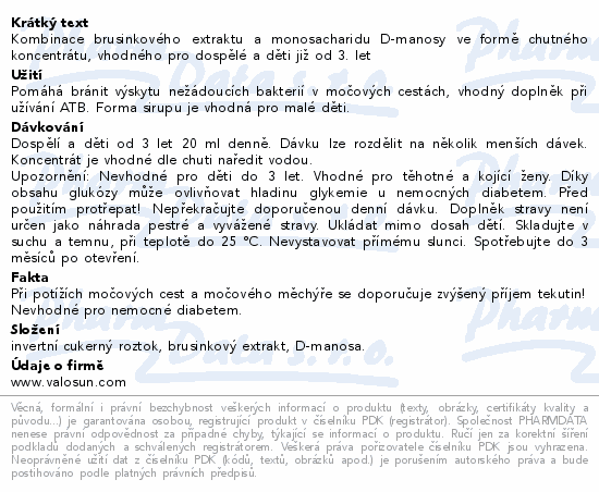 Kombinace brusinkového extraktu a monosacharidu D-manosy ve formě chutného koncentrátu, vhodného pro dospělé a děti již od 3. let