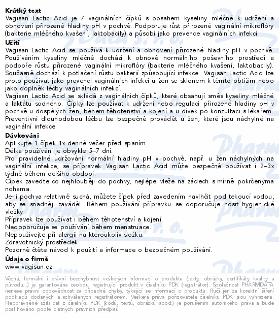 Vagisan Lactic Acid je 7 vaginálních čípků s obsahem kyseliny mléčné k udržení a obnovení přirozené hladiny pH v pochvě. Podporuje růst přirozené vaginální mikroflóry (bakterie mléčného kvašení, laktobacily) a působí jako prevence vaginálních infekcí.