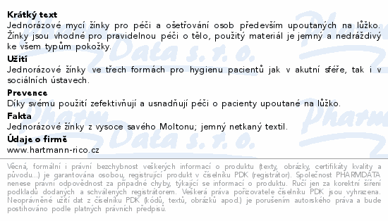 Jednorázové mycí žínky pro péči a ošetřování osob především upoutaných na lůžko. Žínky jsou vhodné pro pravidelnou péči o tělo, použitý materiál je jemný a nedráždivý ke všem typům pokožky.