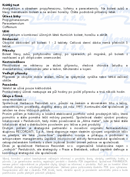 Analgetikum s obsahem propyfenazonu, kofeinu a paracetamolu. Na bolest zubů a hlavy, menstruační bolesti a na snížení horečky. Čtěte pozorně příbalový leták.