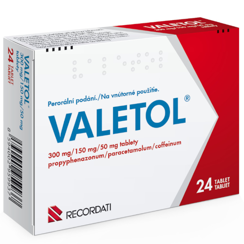 Valetol je složený přípravek obsahující kombinaci léčivých látek – propyfenazon, paracetamol a kofein. Propyfenazon působí proti bolesti, horečce a zánětu. Čtěte pozorně příbalový leták.