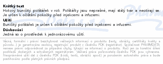 Hotový buničitý polštářek v roli. Polštářky jsou neprašné, mají stálý tvar a neotírají se. Je určen k očištění pokožky před injekcemi a infuzemi.