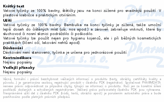 Vatové tyčinky ze 100% bavlny, štětičky jsou na konci zúžené pro snadnější použití. V plastové krabičce s praktickým otvíráním.