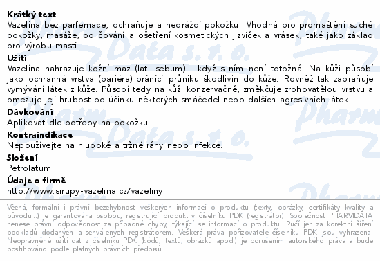 Vazelína bez parfemace, ochraňuje a nedráždí pokožku. Vhodná pro promaštění suché pokožky, masáže, odličování a ošetření kosmetických jizviček a vrásek, také jako základ pro výrobu mastí.