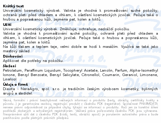 Univerzální kosmetický výrobek. Valinka je vhodná k promašťování suché pokožky, ochraně pleti před chladem a vlhkem, k ošetření kosmetických jizviček. Pečuje také o hrubou a popraskanou kůži, zejména pat, kolen a loktů.