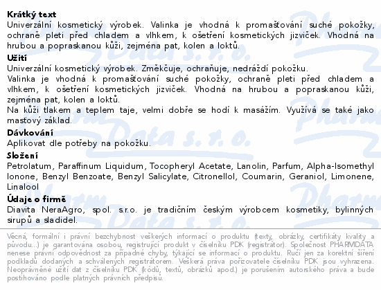 Univerzální kosmetický výrobek. Valinka je vhodná k promašťování suché pokožky, ochraně pleti před chladem a vlhkem, k ošetření kosmetických jizviček. Vhodná na hrubou a popraskanou kůži, zejména pat, kolen a loktů.