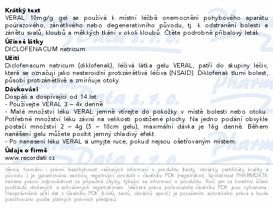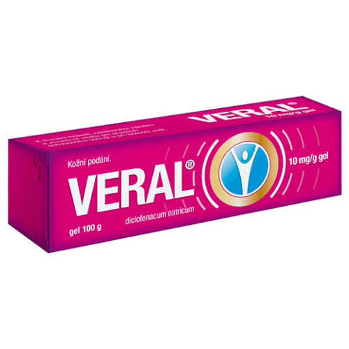 Diclofenacum natricum (diklofenak), léčivá látka gelu VERAL, patří do skupiny léčiv, která se označují jako nesteroidní protizánětlivá léčiva (NSAID). Diklofenak tlumí bolest, působí protizánětlivě a zmírňuje otoky.