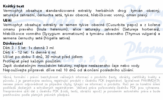 Vermophyt obsahuje standardizované extrakty herbálních drog: tymián obecný, saturejka zahradní, černucha setá, tykev obecná, hřebíčkovec vonný, oman pravý.