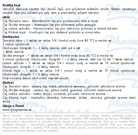 Vánoční dárková kazeta čtyř druhů čajů, pro příjemné sváteční chvíle. Balení obsahuje chutné čaje pro užívaní po celý den a pravidelný příjem tekutin.