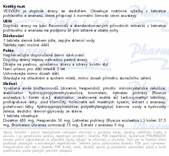 VESVEIN je doplněk stravy se sladidlem. Obsahuje rostlinné výtažky z listnatce pichlavého a ananasu, které přispívají k normální činnosti cévní soustavy.