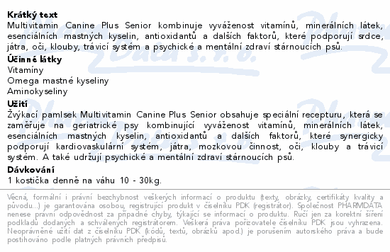 Multivitamin Canine Plus Senior kombinuje vyváženost vitamínů, minerálních látek, esenciálních mastných kyselin, antioxidantů a dalších faktorů, které podporují srdce, játra, oči, klouby, trávicí systém a psychické a mentální zdraví stárnoucích psů.